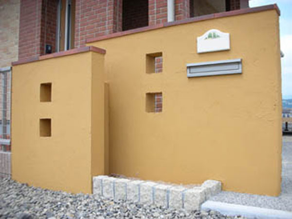 隙間は、ブロックでつながっているので、一枚だけよりも強度も強くなります。道路側の開いたスペースは花壇にすることで、やわらかい印象になります。